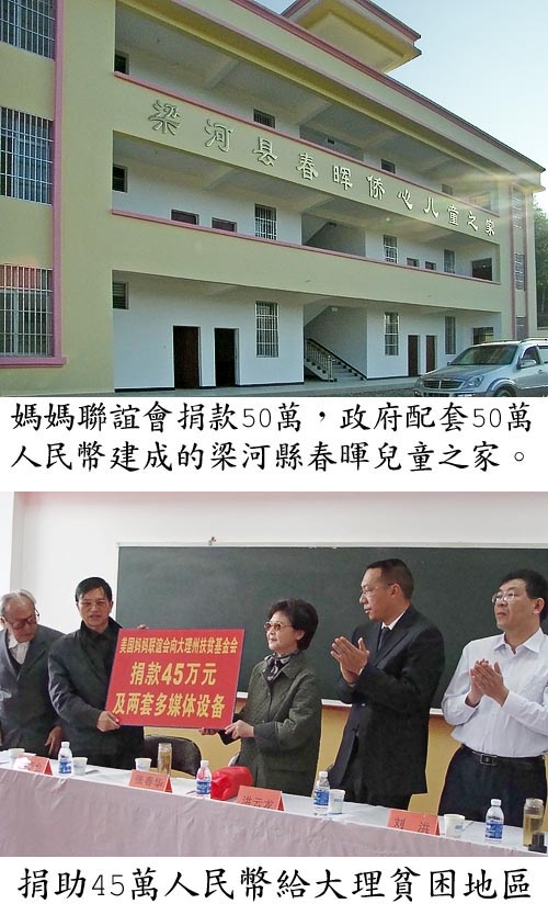 - 資助包括德宏州各縣市400名;大理州各縣市300名;紅河州瀘西縣100名;普洱市瀾滄縣30名;昆明市西山一中50名;華坪兒童之家50名小學至高中的孤兒及特困生930名,及雲南省各地州在昆明各大學就讀的特困大學生100名,總共1030人。資助金額78萬5千人民幣。